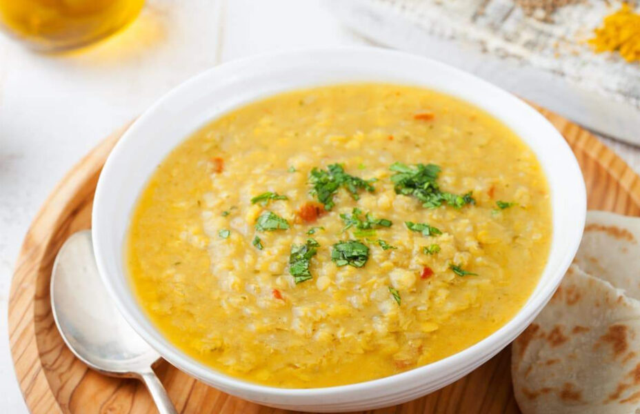 Würzige Dal-Suppe auf Linsengrundlage, nährend und leicht gewürzt.