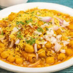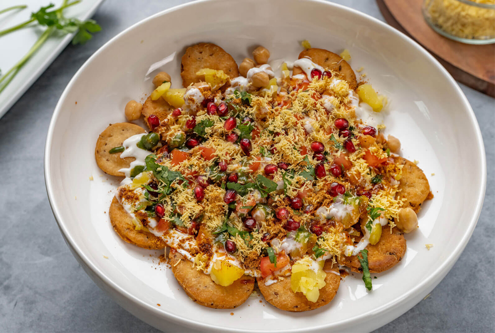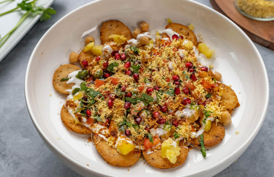Knuspriger, würziger Streetfood-Salat mit Papdi, Joghurt und Chutneys.