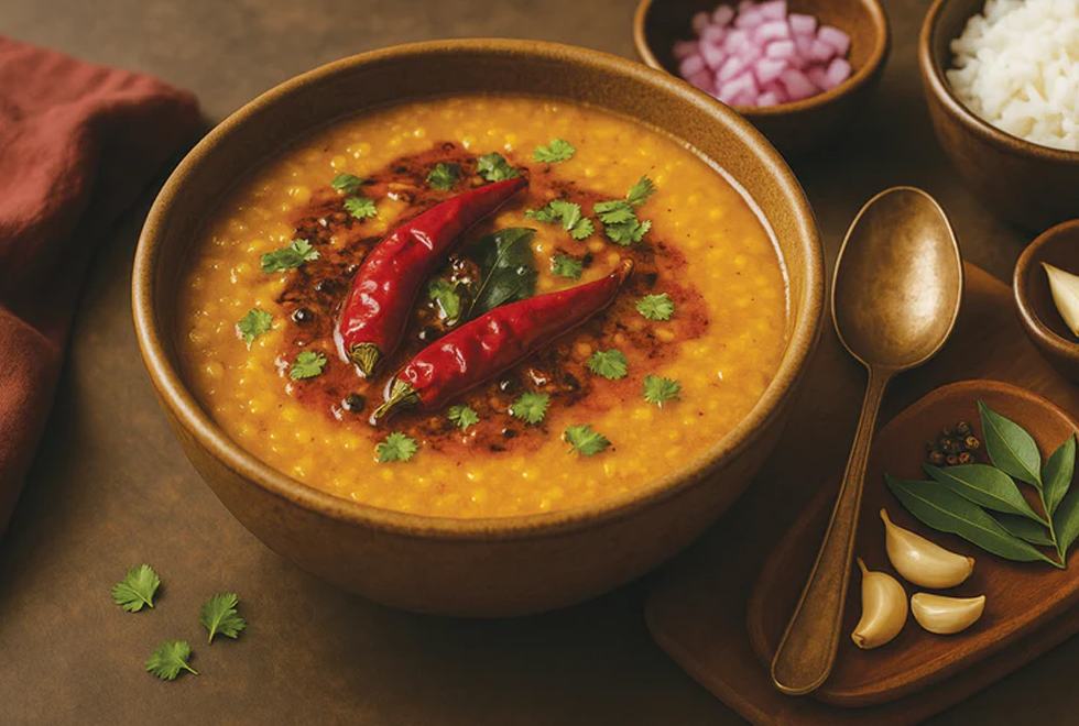 Traditionelle gelbe Dal mit temperierter Gewürzmischung (Tadka).
