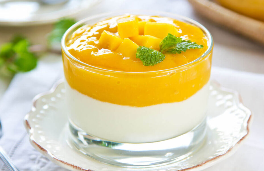 Cremiges Mangodessert, kalt serviert; fruchtig und reichhaltig.